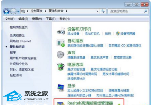 1、如果声音图标依然打红叉,则依次点击开始按钮_控制面板_硬件和声音_Realtek高清晰音频管理器。