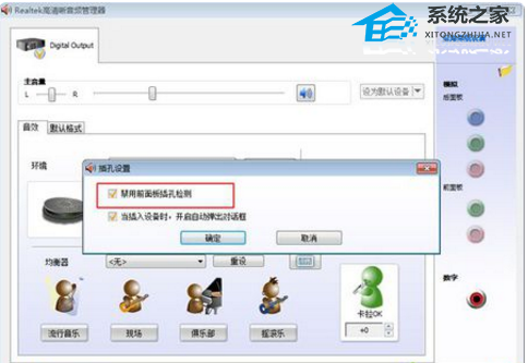 3、勾选“禁用前面板插孔检测”,点击确定,这时候后右下角的小喇叭红叉就消失了,电脑就有声音了。