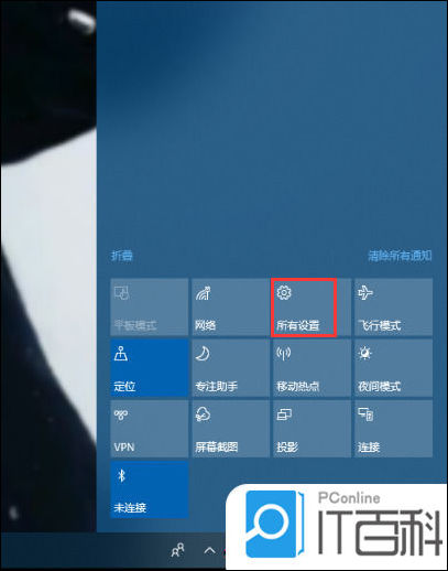 1. 首先,点击任务栏右下角的"通知图标",选择"所有设置"进入;