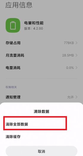 5、在搜索到的电量和性能功能界面中点击最下方的【清除数据】;
