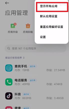 3、然后点击应用管理界面中的右上角的三个点,然后在弹出的功能中点击【显示所有应用】;