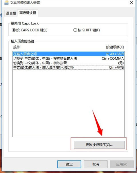 5、输入语言的热键下面选择在输入语言之门,随后点击更改按键顺序。