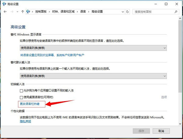 4、在高级设置的界面中我们点击更改语言栏热键。