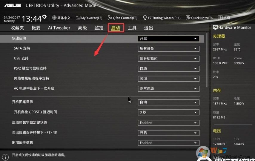 2、进入高级模式后,按→方向键移动到"启动"选项,如下图所示;