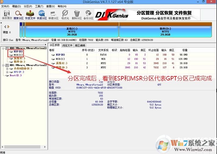 4、分区完成后可以看到ESP和MSR分区代表GPT分区完成,如下图所示;