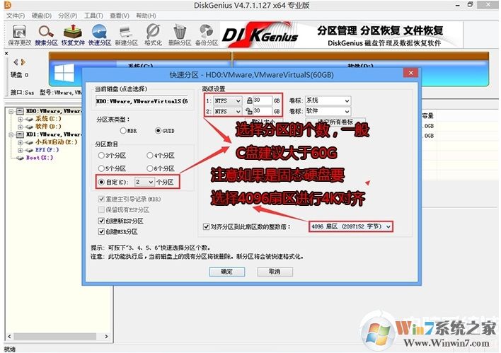 3、在弹出的【快速分区】界面,我们这里选择好分区的类型GUID和分区的个数以及大小,这里一般推荐C盘大小大于60G比较好,然后注意如果是固态硬盘要进行4K对齐,如下图所示;