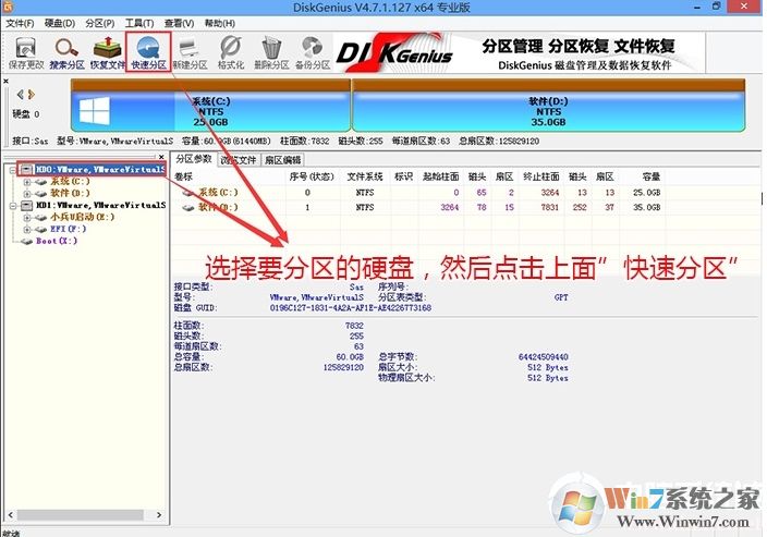 2、然后选择要分区的硬盘,点击上面【快速分区】,如下图所示;
