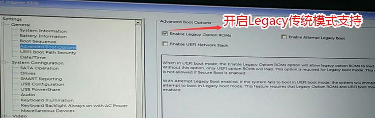 2、切换到Advanced Boot Options将右边的Enable legacy option roms选项打勾,如图: