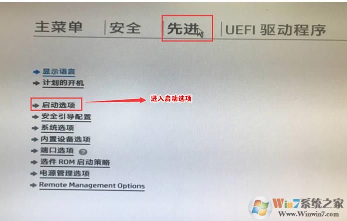 5、F10保存重启后再次开机按ESC,然后选择F10进入BIOS设置,将鼠标移动"先进"选项中,选择"启动选项"后回车进入,如下图所示;