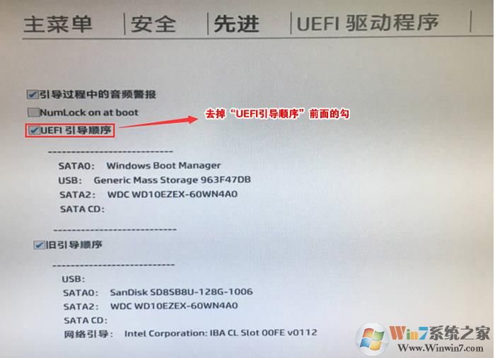 6、进入后将UEFI顺序前面的勾去掉,让机器默认为传统启动,这样方便安装WIN7,如下图所示;