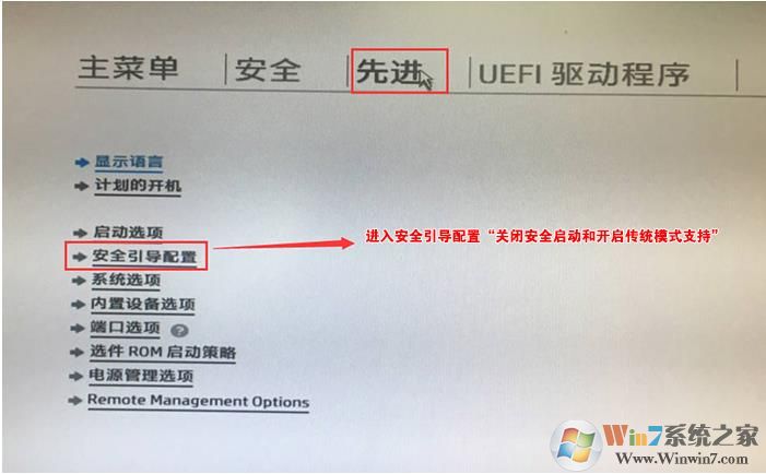 2、进入BIOS后,将移动键盘到"先进"选项下,选择"安全引导配置",按回车键进入设置;