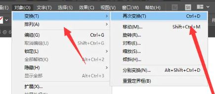 6.然后选中复制的图像,点击菜单栏中的"对象"选项,在弹出的下拉框中点击"变换"和"再次变换",或者点击"Ctrl D"快捷键。图像将被再次复制,并且复制的图像的距离和角度是相同的。