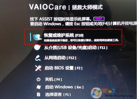 2、启动进入VAIOCare拯救大师模式,选择"恢复或维护系统";这是sony独有的哦。