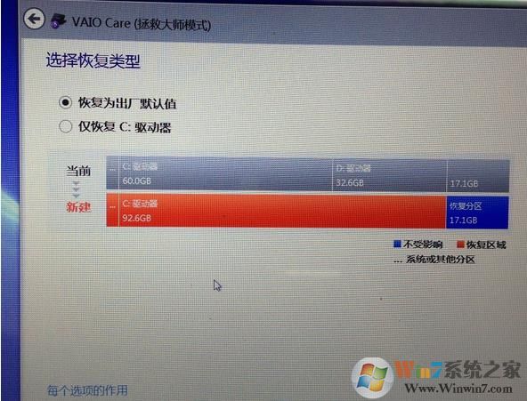 11、选择恢复类型,"恢复为出厂默认值"是恢复到一个盘,所有数据都删除,"仅恢复C:驱动器",仅恢复C盘数据,其他盘数据不受影响;