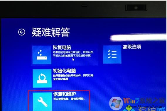 5、选择"恢复和维护";(如果是Win10系统可以使用恢复电脑选项也是可以的)