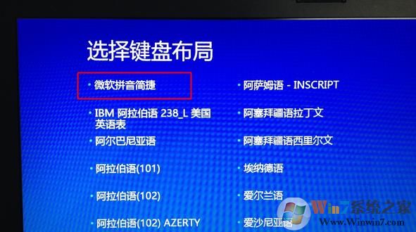 3、选择键盘布局,选择微软拼音,进入中文界面;
