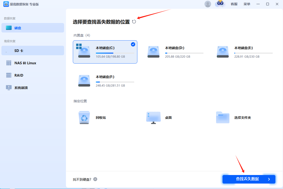 第一步:启动易我数据恢复,在软件界面中,选中删除视频的硬盘分区,点击“查找丢失数据”,开始扫描。