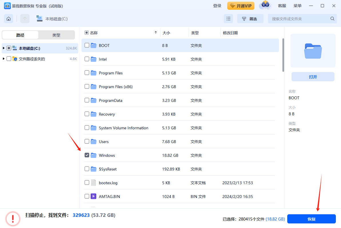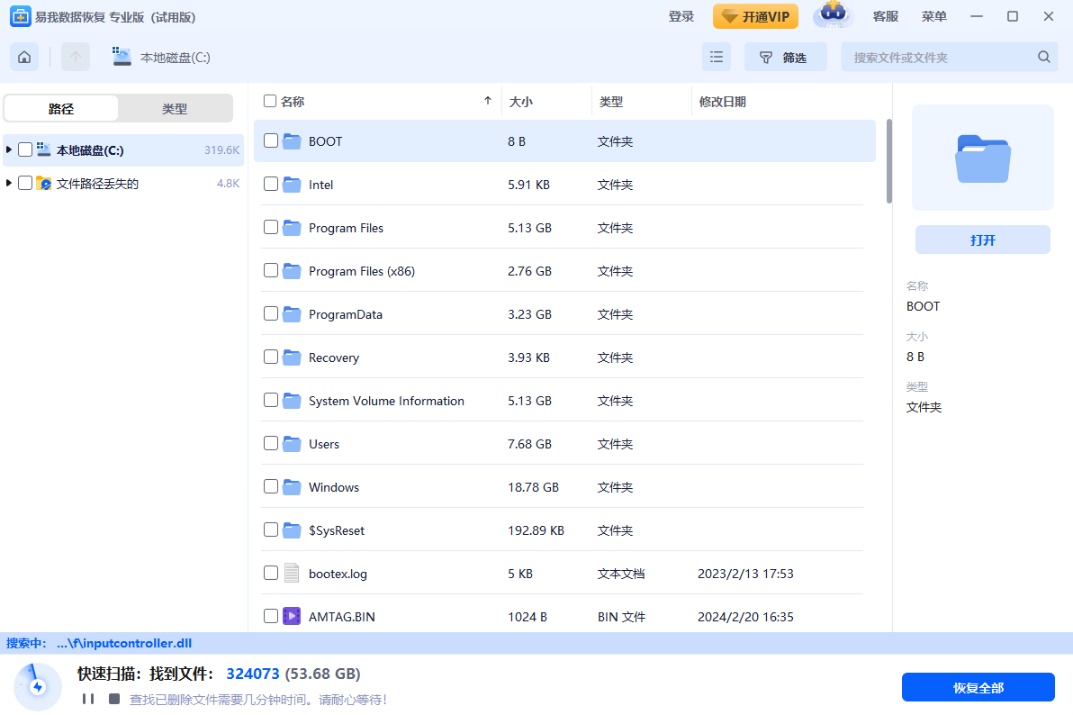 注意:系统文件不要直接恢复到丢失前的磁盘(如C盘)中,应先恢复到安全的备用盘里,以免数据覆盖。在使用软件的过程中可以随时联系软件客服,获取专业的技术支持服务。