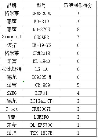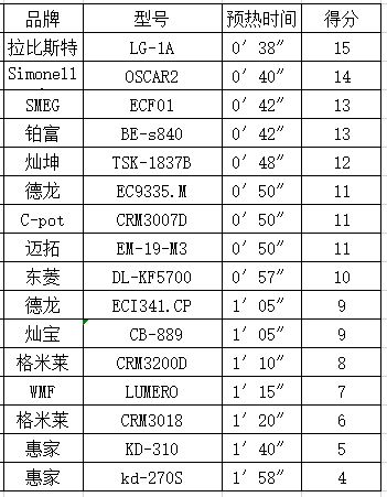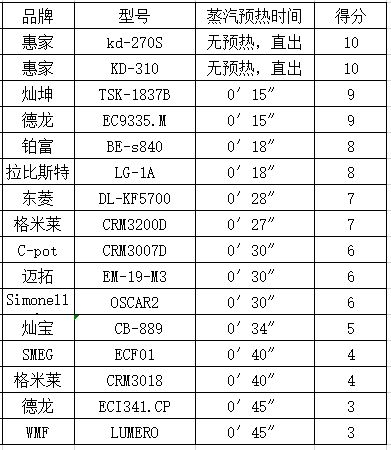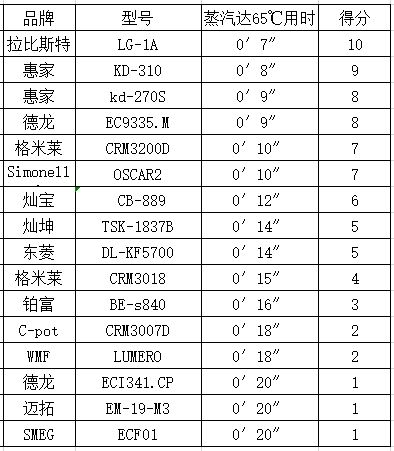 小结:蒸汽的预热时间只是操作体验上的一个参考值,而真正考量能否打出漂亮的奶泡的关键是咖啡机能不能达到65℃的蒸汽温度。16台专业级家用咖啡机在此测试环节中均做到了。其中拉比斯特咖啡机的用时最短,预热完成后,7秒钟的时间就到达了最适宜的打奶泡温度。