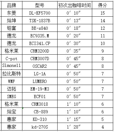 小结:16台咖啡机萃取的总时间各不一样,C-POT3007D咖啡机所花的时间最长,需要50秒内完成一杯咖啡。而出咖啡的时间一般是越接近25s越好。如果是制作单杯可以偏低2s,双杯咖啡分量则可以偏高2-3s。