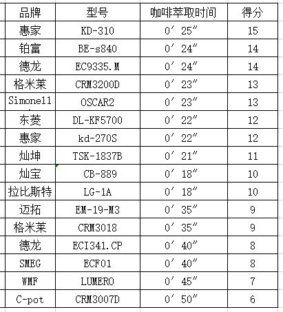 其中,惠家KD310萃取咖啡25秒,铂富s840、德龙EC9335.M、格米莱3200D、Simonell OSCAR2等都十分接近25秒。