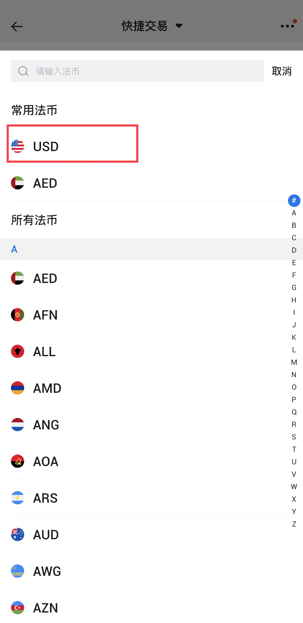 点击上方选择BTC或USDT(稳定币),此处以USDT为例。