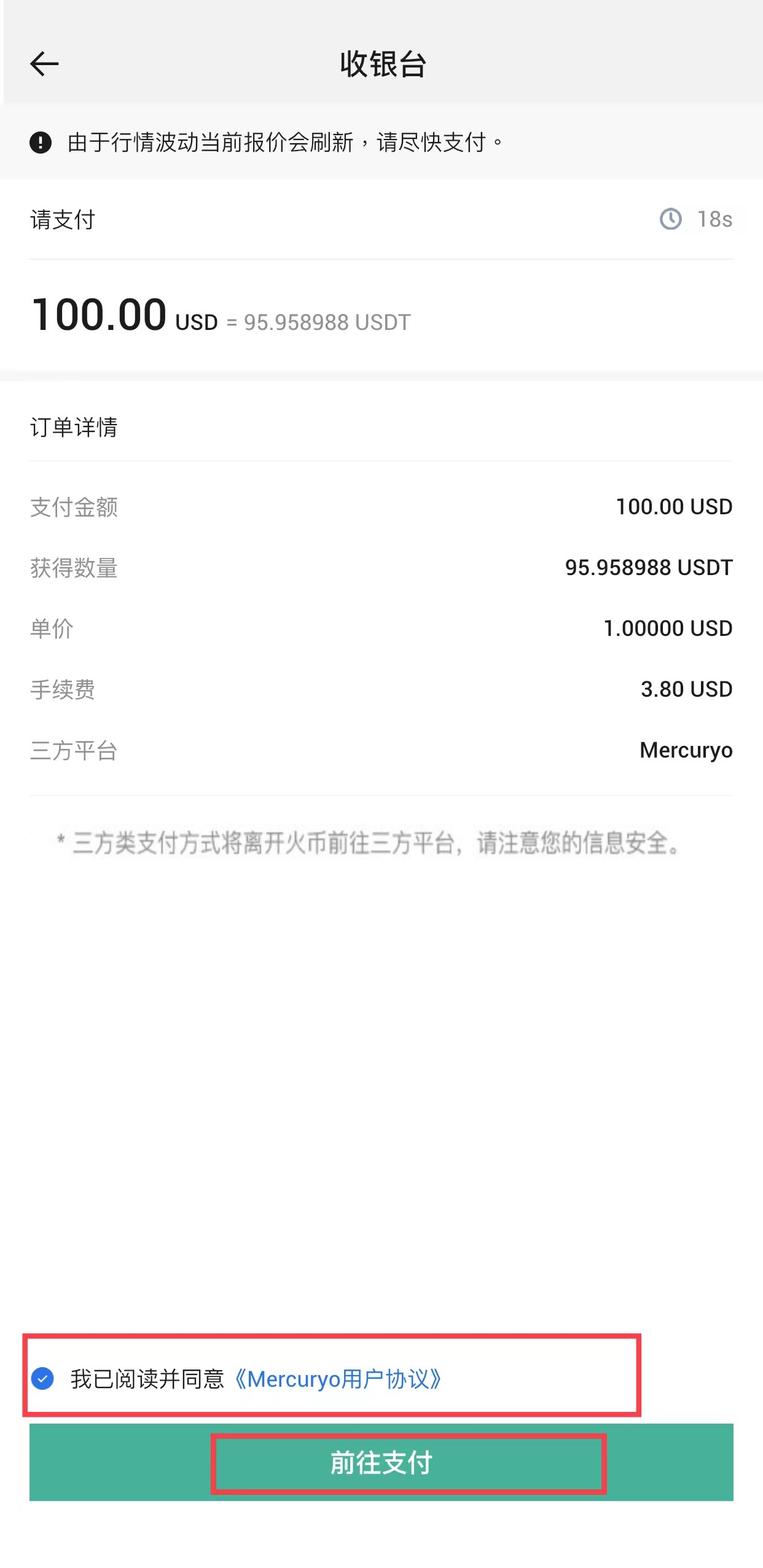 选择您喜欢的支付方,如Mercuryo,随后点击【购买USDT】