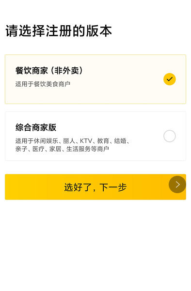 2、然后选择注册的版本,【餐饮商家】、【综合商家】。在下这边选择【餐饮商家】,点击选好了,下一步;
