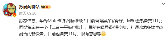 【太平洋科技快讯】10 月 21 日消息,据知名数码博主近日爆料,华为 Mate 80 系列已备案,预计将在今年 11 月与消费者正式见面。其中 Mate 80 标准版代号代号“Voyager”,拥有黑、白、青绿三种配色。