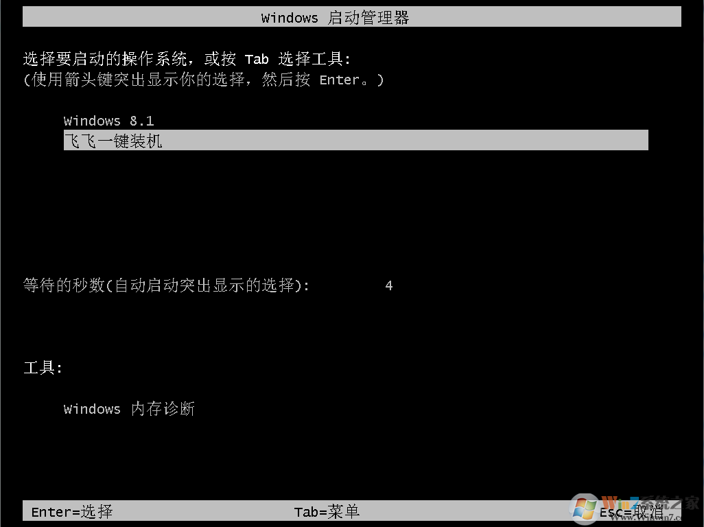 7、重启后一切是自动的,飞飞一键重装会给Win8添加一个安装启动项,如下图,自动将进行安装。(借用Win8的图,是一样的)