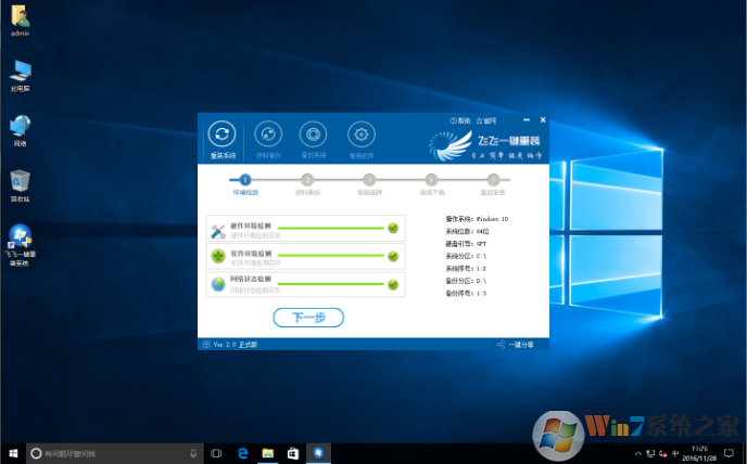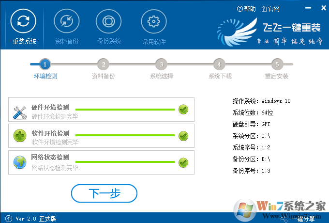2、这时软件会先进行环境检测(右侧会显示你当前系统信息及硬盘状态),这里我们可以看到电脑环境信息显示的"硬盘引导"为"GPT",(一般的XP,Win7为MBR)飞飞一键重装支持UEFI+GPT模式,复杂环境无需用户担心。