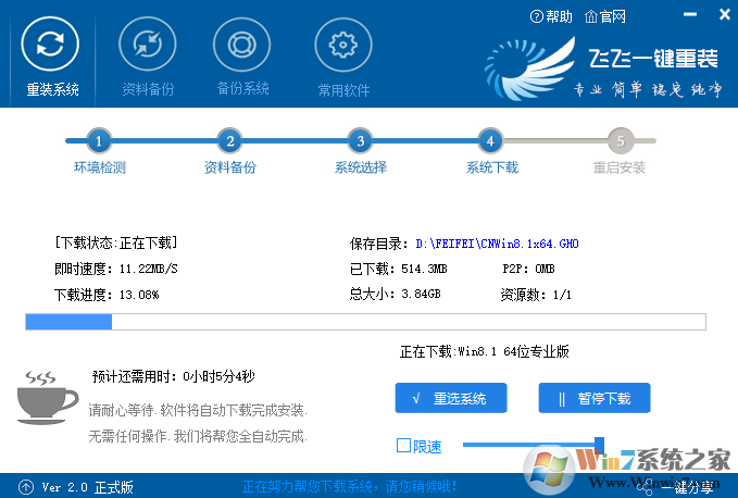 5、开始系统下载,下载速度视你的宽带M数而定,耐心等待就行。这里软件提供了重选系统、下载限速等功能,大家酌情使用!