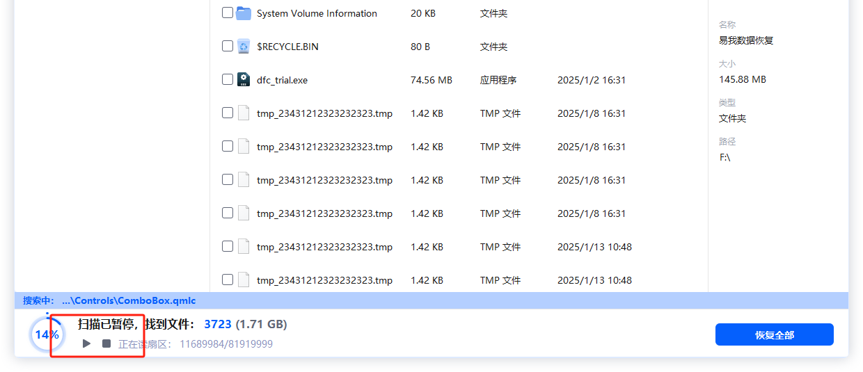 第3步:软件开始扫描选中的存储位置,在此过程中,如果在扫描完成之前你已经找到了需要恢复的图片或视频,可点击右下角的暂停按钮。