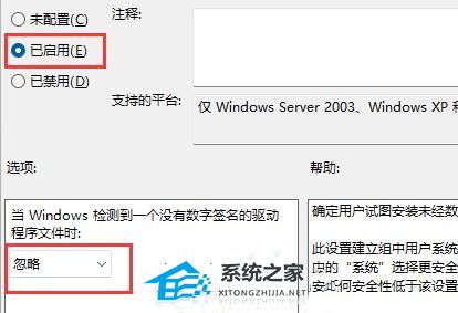 6. 在打开的窗口中,将左上角的“已启用”勾选上,并在下方选项中选择“忽略”,最后点击确定保存即可。