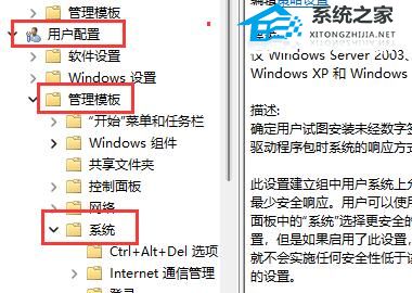 3. 进入到新的界面后,依次点击左侧栏中的“用户配置——管理模板——系统”选项。