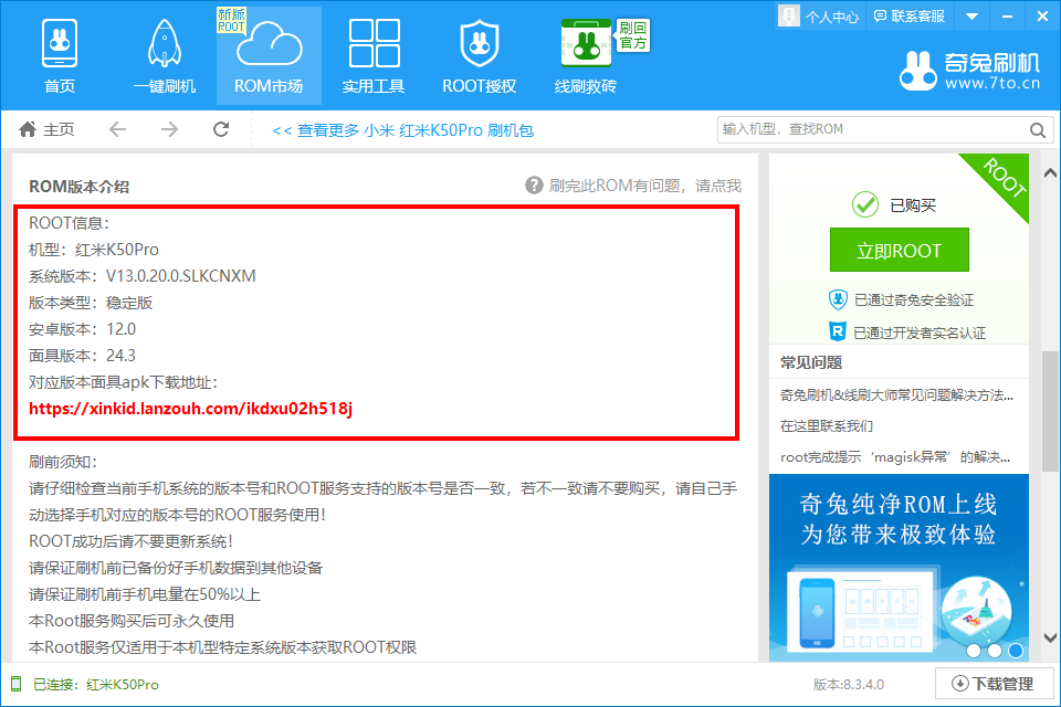 4.等待手机开机后再次连接电脑奇兔刷机,返回软件首页,点击查看详情。在ROOT详情页里下载magisk软件并安装到手机,电脑奇兔刷机软件点击——root授权,出现下示图片,且手机出现magisk图标的app则表示已经当前已成功获取ROOT权限