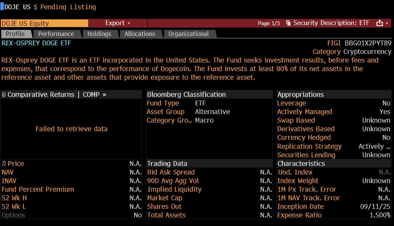 狗狗币 (DOGE),这个最初的迷因币,即将迈出历史性的一步,进入主流金融领域。2025 年 9 月 11 日,Rex Osprey 的 狗狗币 ETF ($DOJE) 将根据《1940 年投资公司法》在美国市场首次亮相,推出首个与全球最知名的迷因币挂钩的美国交易所交易基金。市场已有所反应,在首次亮相前,狗狗币价格已上涨 11.5%,交易者预期将有机构资金流入。