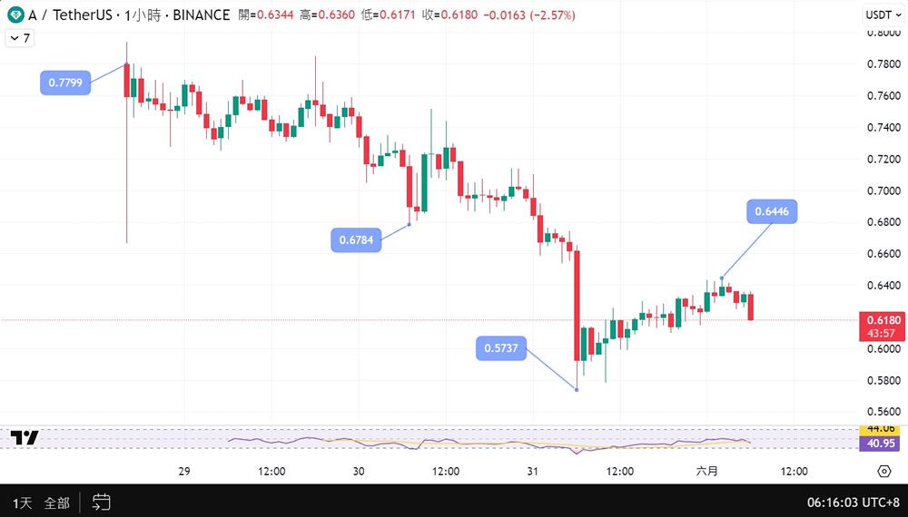 Vaulta($A)于2025 年5 月29 日正式上线币安交易所,开盘一度冲高至0.7799 USDT,但随即出现明显抛压,隔日跌至0.5737 USDT。虽然6 月初反弹回到0.6446 USDT,整体仍处于上线初期的震荡整理阶段,市场情绪多在观望转名效应是否能持续发酵。