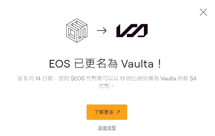 品牌改名同时,Vaulta 也推出新代币$A,用以取代原本的$EOS。代币交换机制于2025 年5 月启动,由Coinbase、Binance 等主流交易所支持,交换比例为1:1。