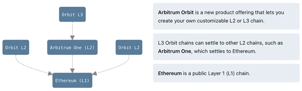 Arbitrum Orbit 是使用Arbitrum 技术开发的无需许可的路径,用于启动可自订的L2 或L3 链。在这里,轨道链是建立在以太坊第1 层区块链上的第2/3 层链。