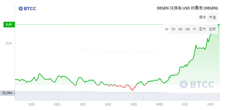 根据行情数据,DEGEN 最新交易价格为$ 0.008288 ,换算为台币价格为0.2674。该加密货币过去24 小时的价格变化为109.74%,交易量达到$ 768.4M。