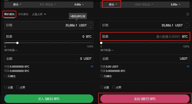 7、选择【全仓/逐仓】、【USDT保证金】、【杠杆倍数】、【限价委托】—输入【价格】、【数量】或者【金额】—点击【卖出(做空)BTC】—【确认】。