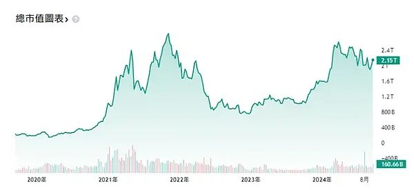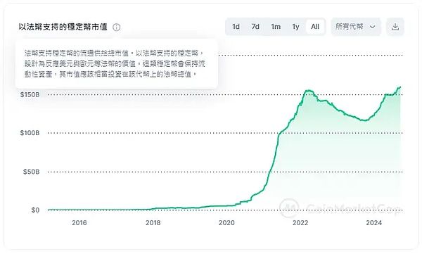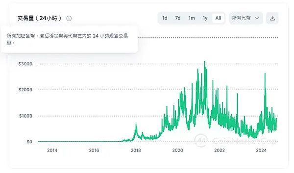 总市值是我们了解市场流动性的因素之一,可以看到在2020 年降息之后,加密市场市值开始攀升,达到2021 年的3 万亿市值顶峰,不过总市值会因为币价波动而有所偏差。