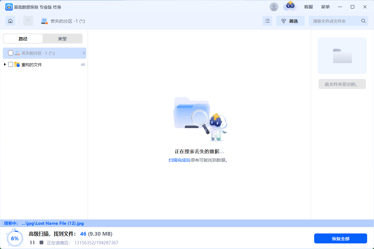 步骤2.在扫描过程中可以随时暂停或终止扫描,也可以对找到的文件进行免费预览,或执行恢复操作。扫描完成后或在发现对应文件后暂停/终止,找到并勾选文件进行恢复。如果您记得原始文件路径,可以通过路径找到数据,否则,您可以通过类型找到文件。右上角搜索文件或文件夹名称,可以帮助您快速找到所需文件。