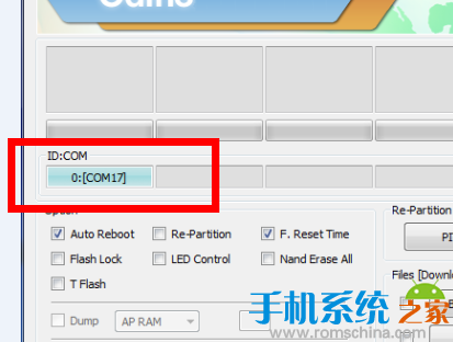 4.打开odin软件之后软件会自动识别你的手机,识别成功后会在ID:COM处显示蓝色的(表示手机连接成功了,如果没有显示蓝色的,说明没有有连接好),然后勾选PDA,选择刚才下载下来的tar格式的recovery包;