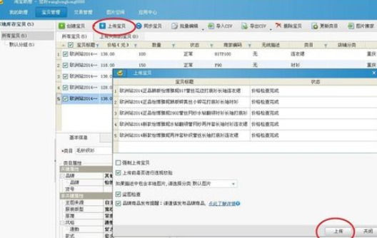 成功导入商品后,勾选这些宝贝,点击”上传宝贝"按钮会弹出一个上传宝贝窗体,点击窗体下面的上传,开始上传宝贝