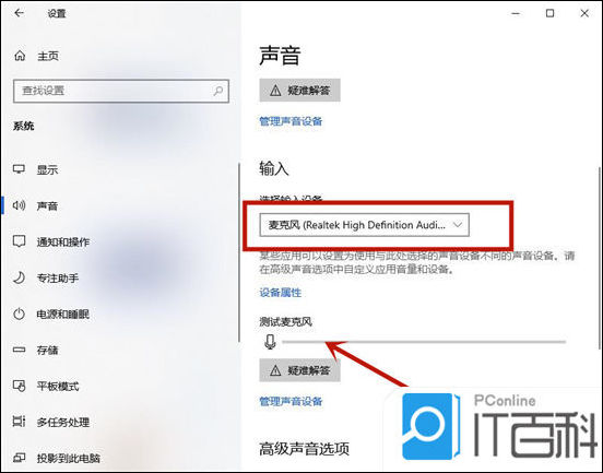4. 在"声音"面板下,将输入设备选择"麦克风"即可,我们也可以点击下方的测试麦克风进行测试。