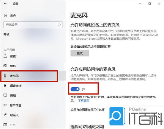 2. 在左侧选择"麦克风",然后将"允许应用访问你的麦克风"选项打开;