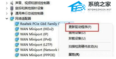 2. 接着,找到网络适配器并右键点击选择“更新驱动程序”。