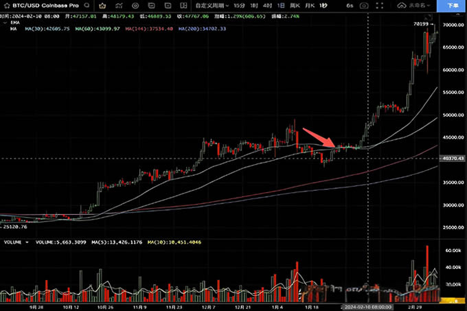 1、2024年春节假期为:2月10日(除夕)-2月17日。在春节前的30天即1月10日,即使在比特币ETF已经通过的加持下,仍然从49,102下跌至38,501,跌幅21.59%。但随着ETF效应加持,春节假期期间开启上涨模式。